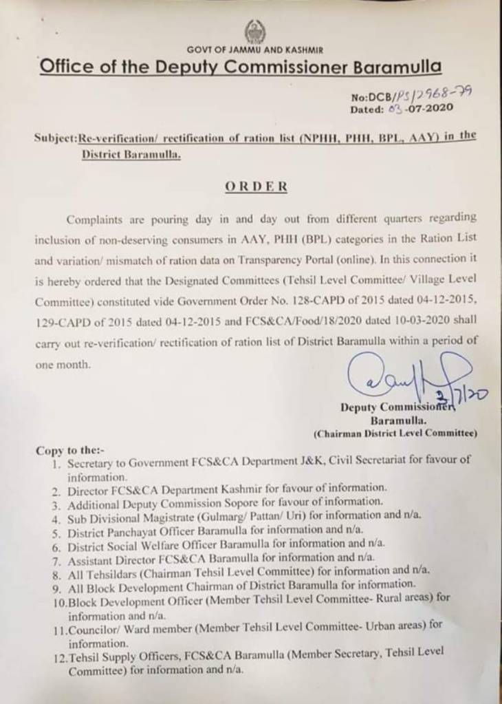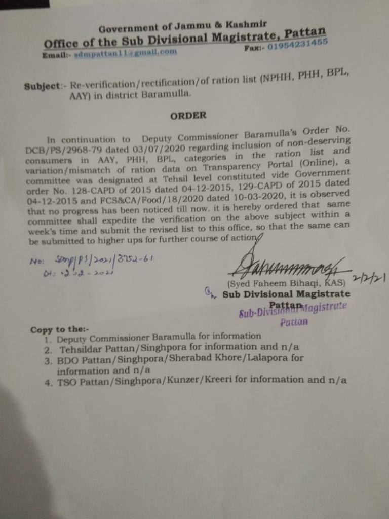 “Deputy Commissioner Baramulla, who is the chairman of NFSA District Level Committee for identification of beneficiaries under various ration categories(NPHH/AAY/PHH) has already issued an order regarding Re-verfication and Rectification of ration lists of the whole district vide order no.DCB/PS/2968-79 dated 03-07-202O and because Sub-division Patten is yet to submit the re-verified ration list ,in this backdrop SDM Pattan has ordered to expedite re-verification and rectification of ration cards (NPHH, PHH, AAY) vide order no. SDM/PS/2021/3752-61 dated 02-02-2021 which is under process,” the statement reads.