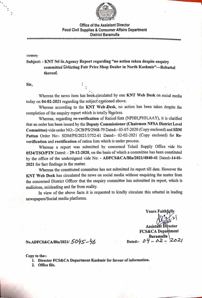 Accordingly, the news agency has issued a press release wherein they alleged that a fair price shop dealer of Baba Gund Mamoosa Pattan namely Abdul Hameed Mir has been held responsible for carrying out several fraudulent activities by a departmental enquiry committee constituted by FCS&CA Baramulla vide order no ADFCS&CA/Bla /2021/4840-41 dated 14-01-2021. However, the Assistant Director has clarified that the committee which has been constituted to carry out the in depth enquiry, has not submitted its report till date and the news report carried is malicious and misleading.