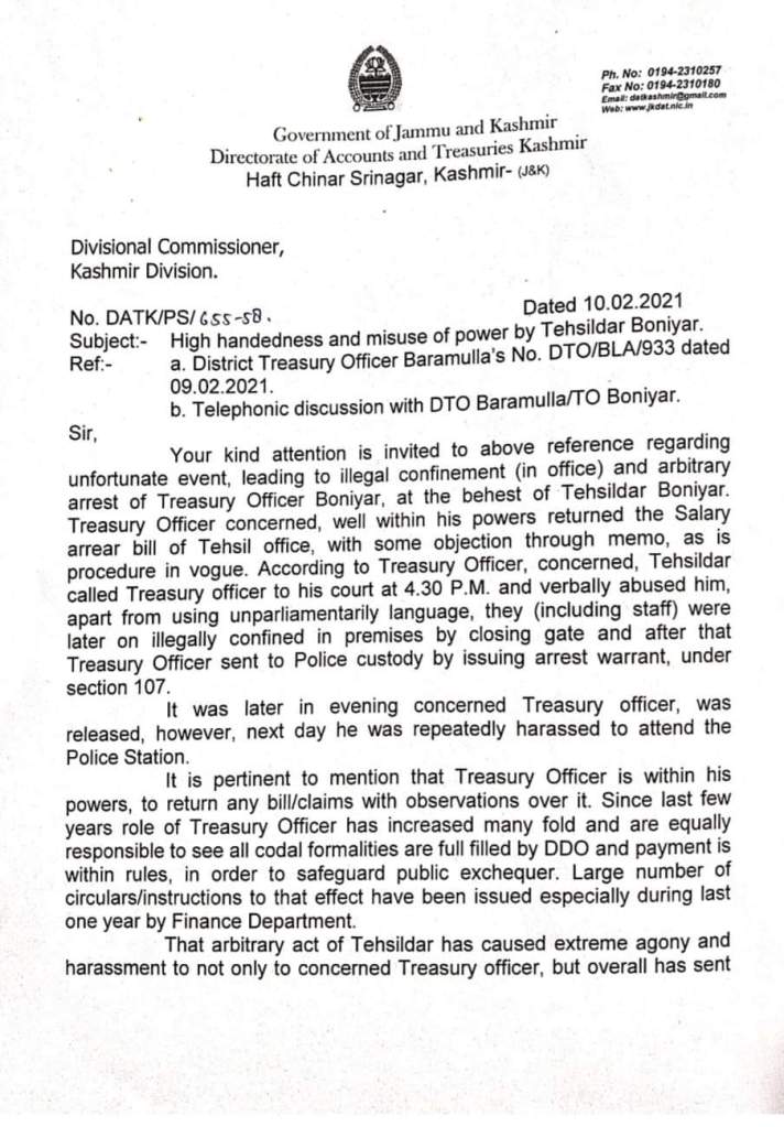 Uri, Feb 11: Director Accounts and Treasuries Kashmir has written a letter to Divisional Commissioner Kashmir, seeking action against a Tehsildar Boniyar in Baramulla for allegedly arresting a treasury officer for being a “threat to peace” after the latter returned a salary arrears bill of Tehsil office with some objections as per the “procedure”.