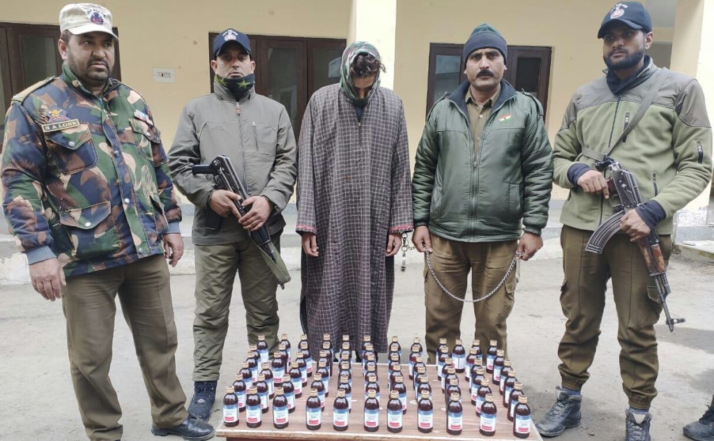 In Continuation to the drive against drugs Police party of P/S Boniyar arrested a drug peddler namely Mudasir Ahmad Tantaray S/O Lt Farid Ah Tantaray R/O Boniyar A/P Khanpora Baramulla and recovered (67) Bottles of Codeine Phosphate from his possession. The accused was arrested during routine naka checking at Children’s park Boniyar. Accordingly,case FIR NO.08/2021 U/S 08/22 NDPS Act has been registered in police station Boniyar and Investigation taken up.