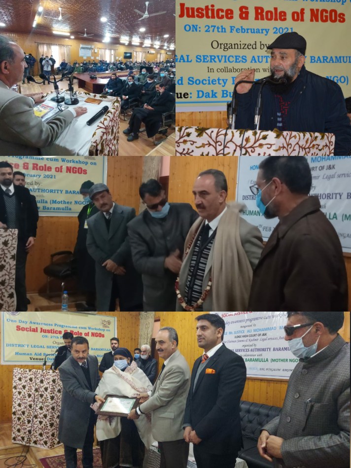 District Legal Services Authority (DLSA) Baramulla in collaboration with Human Aid Society organized a day long awareness cum workshop on ‘Social Justice and Role of NGOs’ at Dak Bungalow Baramulla on Saturday.