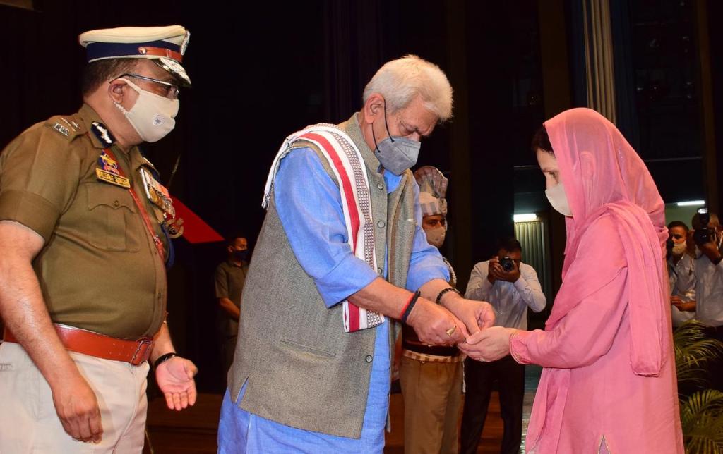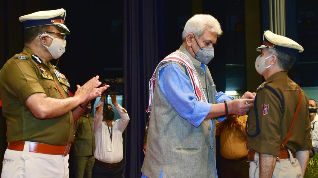 Lieutenant Governor, Manoj Sinha today presented the President’s Police Medals for gallantry, distinguished and meritorious services to serving and retired Jammu and Kashmir Police officers/officials, besides NOKs of the martyrs of JKP, at Investiture Ceremony-2021 held here at General Zorawar Singh Auditorium, University of Jammu.