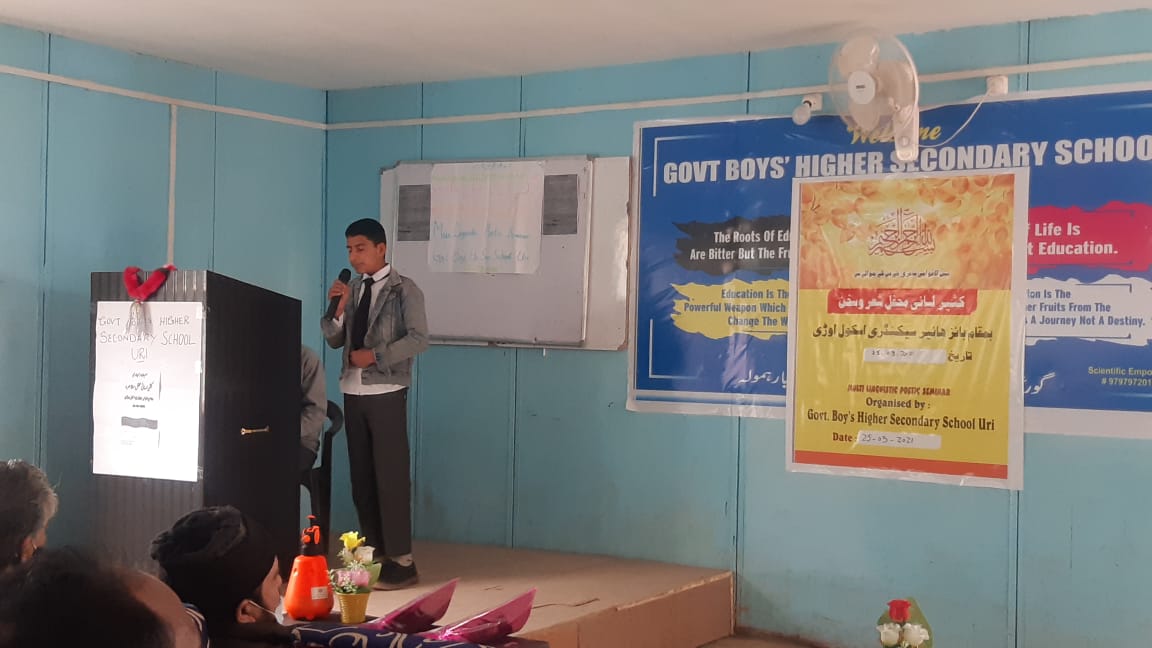 In connection with the world poetry day, a multi linguistics poetry seminar was organised today on 25th of March, 2021at BHSS Uri.The poets and literary persons of Pahari, Gojri, Kashmiri and Urdu languages have participated in the function.The main poets who attended the seminar were Mr Raja Nazar Bonyari, Mr Attaullah Mumtaz, Mr Taj u Din Tak, Mr Shah Mohammad and other prominent poets and literary personalities of Sub Division Uri. The programme was started with the welcome adress presented by Bilal Ahmad Dar (Lecturer English) who highlighted the purpose and objectives in detailed ,of organising of the programme.Mr Raja Nazar Boniyari was the Chief Guest on the occasion who described the programme as a source of inspiration for the students and organising of such programmes will definitely boost the moral of our local poets who rarely find such platforms for presenting their work. He also thanked Mushtaq Sopori principal BHSS Uri for inviting him and his literary colleagues in the function and honour them. Mr Mushtaq Sopori under whose guidance and supervision the seminar was organised thanked all the participants who graced the occasion and spared their precious time to make the seminar successful. SDM Uri Mr Riyaz Ahmad Malik joined the programme at concluding stage because of his busiest schedule and in his speech he highlighted the contributions of poets and literary personalities in the society. He also recited some English translated verses from a Naat translated by Mr Tanveer Ahmad Andrabi Ex Principal of GDC Uri. The Programme was concluded with the vote of thanks presented by Asif Ahmad Wani (PEL).At last the prayers were offered for those poets and literary personalities who have passed away in recent past.