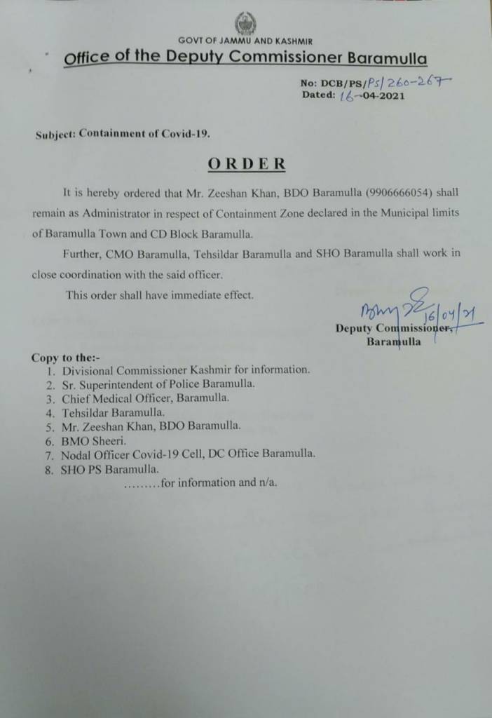 “It is hereby ordered that Mr. Zeeshan Khan, BDO Baramulla (9906666054) shall remain as Administrator in respect of containment Zone declared in the Municipal limits of Baramulla Town and CD Block Baramulla,” the order issued by District Megistrate Baramulla (Deputy Commisioner) vide No: DCB/PS/Ps/ 260-267 dated 16-04-2021 reads.